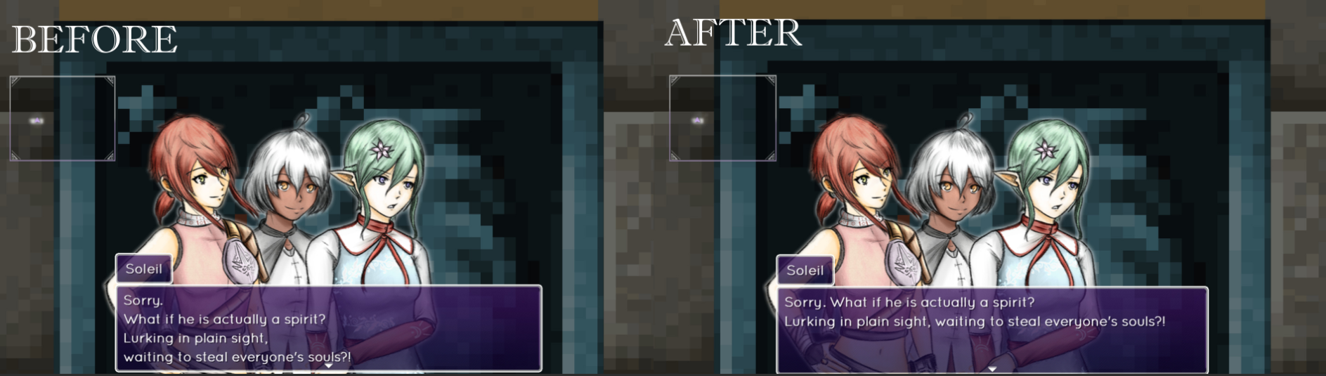 Self-explanatory. Besides fixing a few skill-related issues (namely Pierlis duplicating itself...), I also went back to the earlier dialogue and reformatted to better make use of the textbox space. Originally I used portraits for the text, but since they're removed, there was no need to cut the sentences anymore. It should make reading a tiny bit easier...